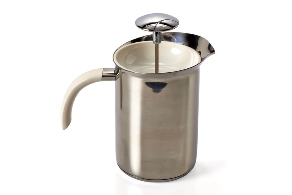 Milchaufschäumen geht noch einfacher: Manuelle Milchaufschäumer stehen selbst dann bereit, wenn weder Stromnetz noch Batterien zur Verfügung stehen. Im Grunde genommen handelt es sich dabei um Milchkännchen, die meist aus Edelstahl, weniger häufig aus Glas und selten aus Kunststoff bestehen. Die Aufschäum-Funktionalität verbirgt sich im Deckel: In seiner Mitte ist ein beweglicher Stab oder Stampfer angebracht. An dessen unterem Ende befinden sich zwei dicht übereinander platzierte Feinsiebe. Der Milchschaum entsteht durch das wiederholte Pumpen mit dem Stampfer.